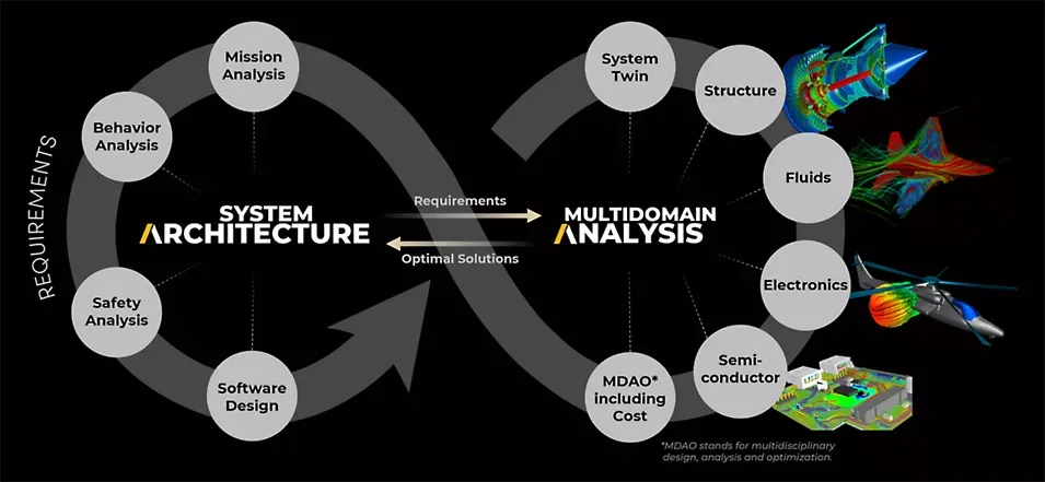 Pokud se rozhodnete využít metodiku MBSE, nejprve vytvoříte systémový architektonický model (SAM), který zachycuje všechny klíčové požadavky na letoun – včetně toho, že musí zvládnout 3 000 mil bez mezipřistání. Následně SAM použijete k popisu plánovaného návrhu: systémové architektury, požadovaného chování, rozhraní mezi komponentami a dalších specifikací. V tomto bodě použijete simulace k ověření, zda návrh splňuje všechny fyzikální a funkční požadavky. Simulace zahrnují například: